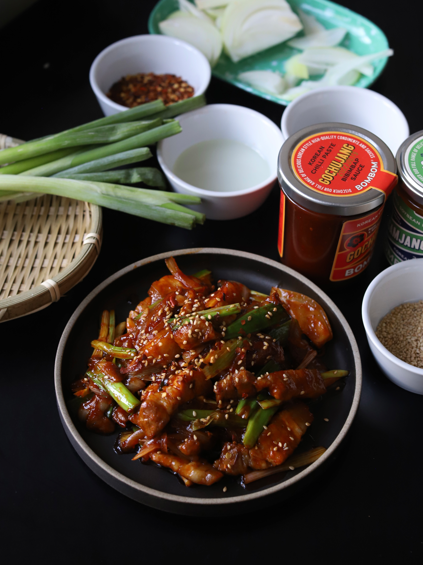 Gochuajng (wheat, water, chili powder, salt, chili seasoning, rice, alcohol, koji), fructooligosaccaride, plum syrup (plum extract, sugar), water, hydrolyzed soy protein (soybean), garlic, garlic concentrate, ginger, paprika extract.